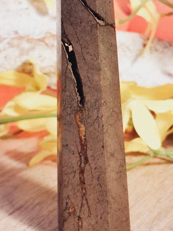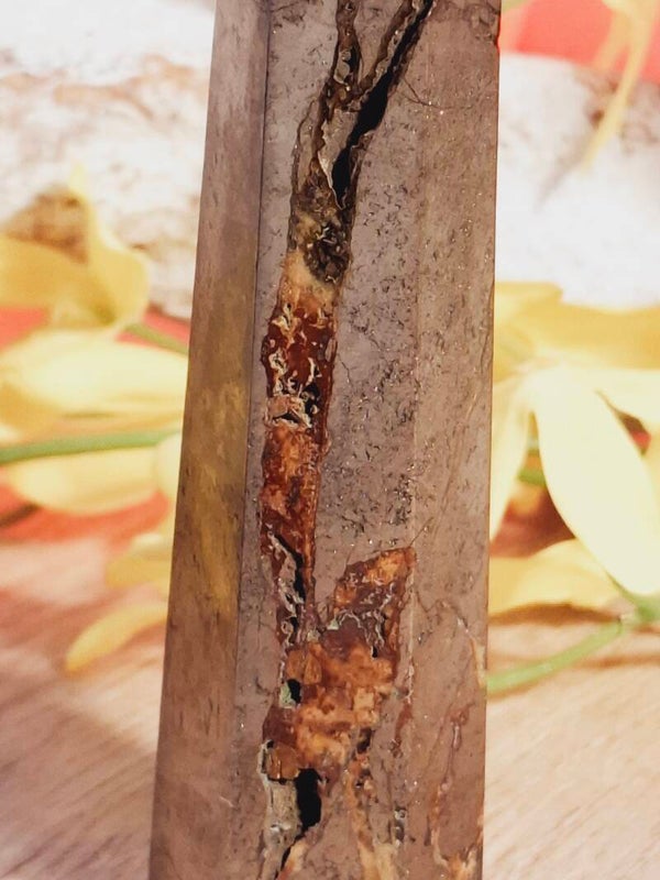 Deze toren heeft een rodelijn in zitten, om dit moment kan je niet vertellen of het ijzeroxide is vanuit een natuurlijk proces of dat het een ander mineraal in zit. Het geeft niet af en het zit in de kleine barstje van het pyriet. Zie foto