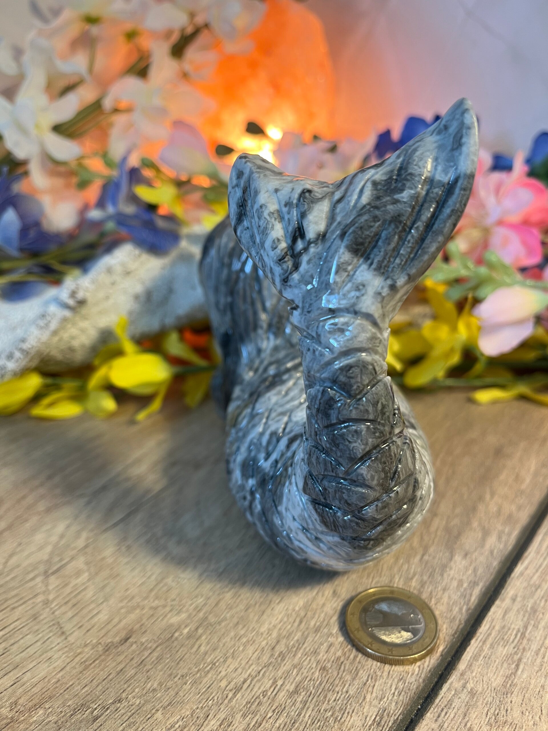 Ze weegt 987 gram is is 12.4 cm lang en 10.4 hoog op de staart.