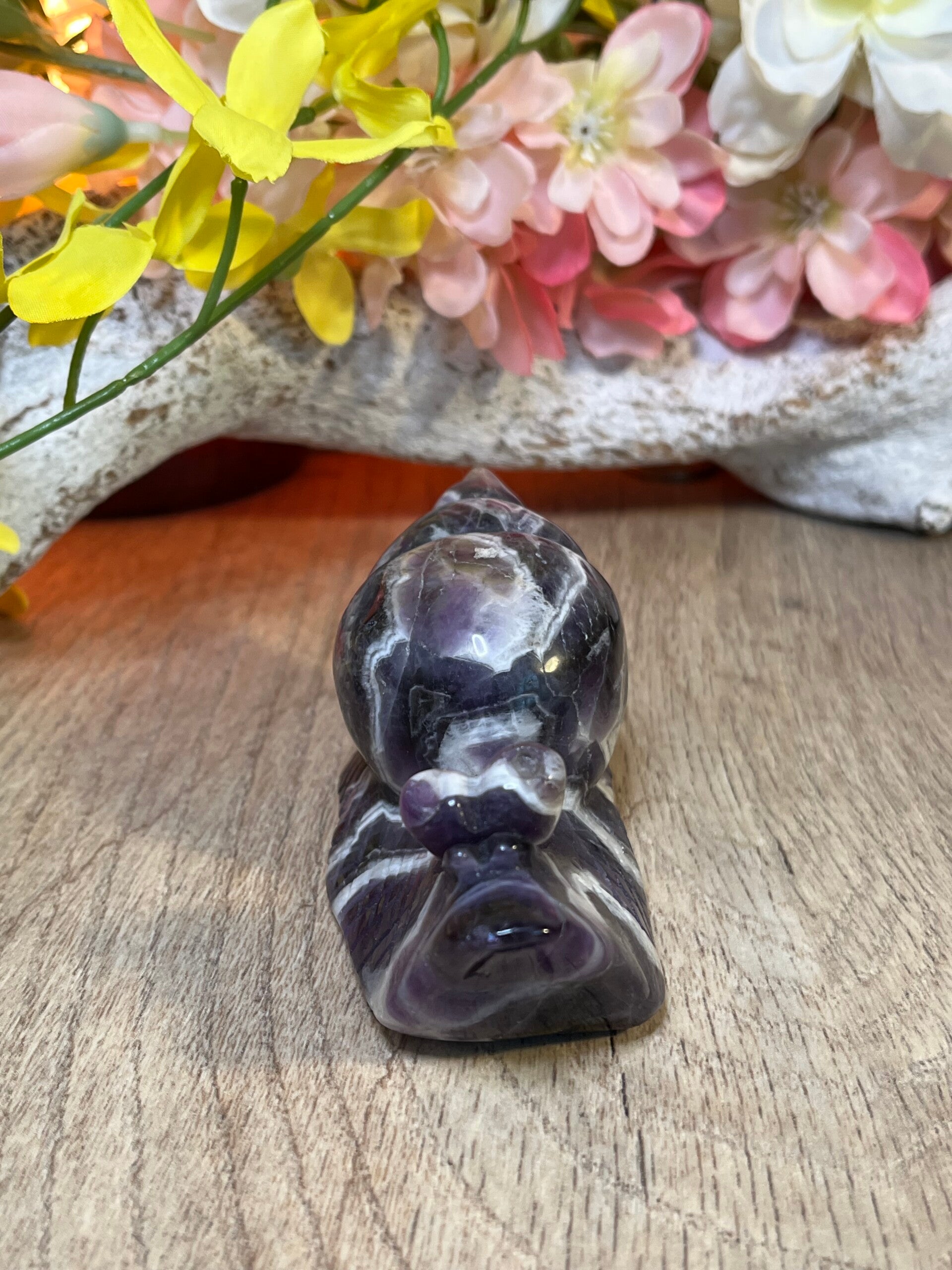 Amethist staat bekend om zijn beschermende, zuiverende en kalmerende energie. De paarse kleur straalt rust uit en helpt om innerlijke balans en mentale helderheid te bevorderen. De steen ondersteunt harmonie en ontspanning, zowel op persoonlijk niveau als in de ruimte waarin hij wordt geplaatst.
