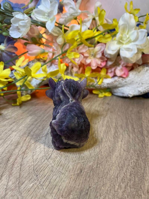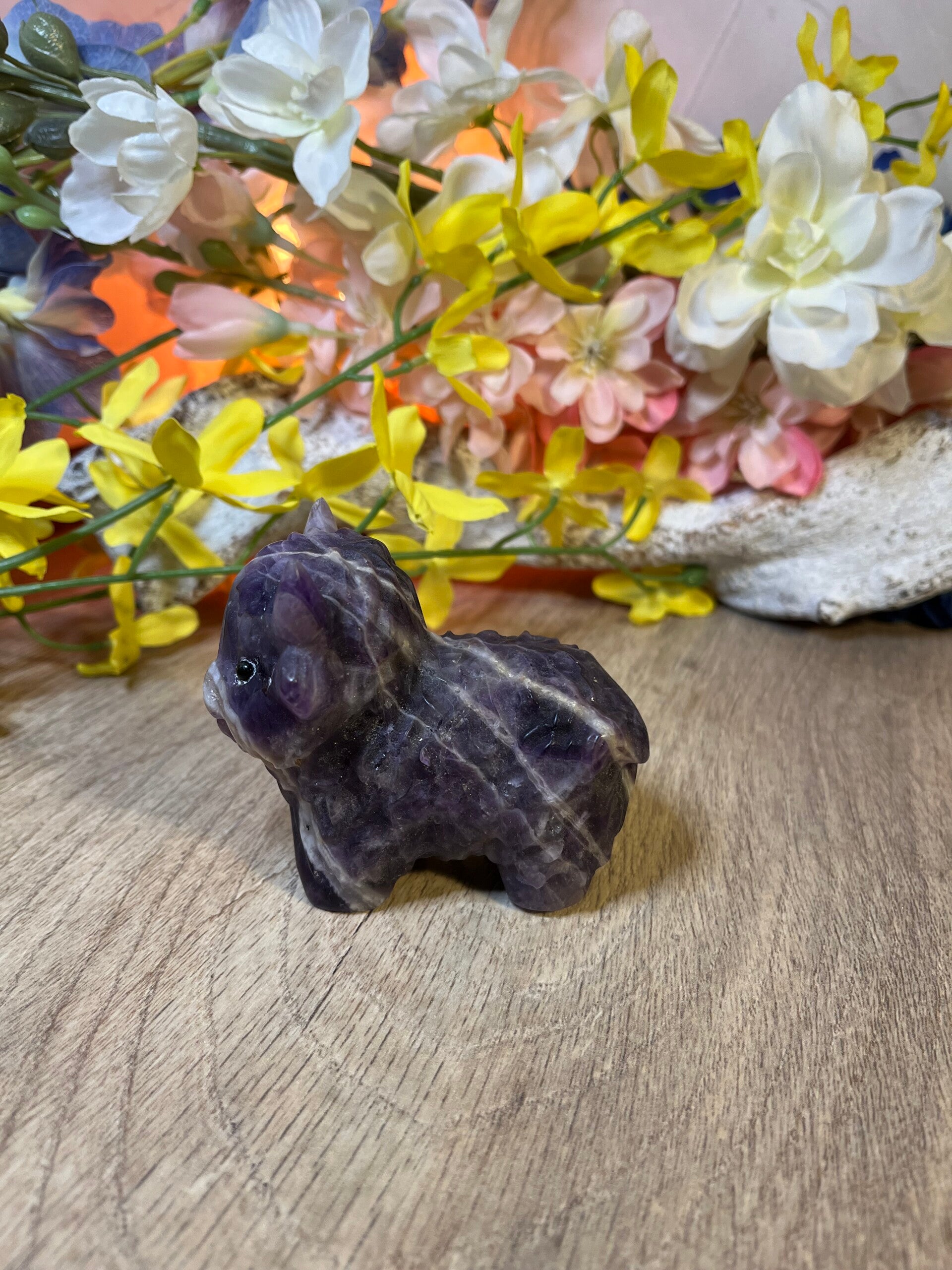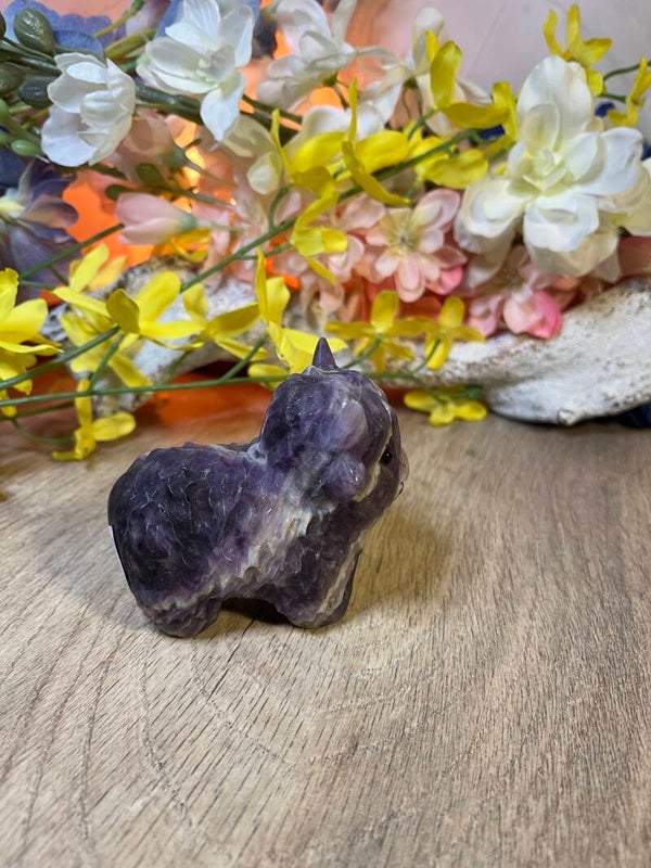 Amethist staat bekend om zijn beschermende, zuiverende en kalmerende energie. De paarse kleur straalt rust uit en helpt om innerlijke balans en mentale helderheid te bevorderen. De steen ondersteunt harmonie en ontspanning, zowel op persoonlijk niveau als in de ruimte waarin hij wordt geplaatst.