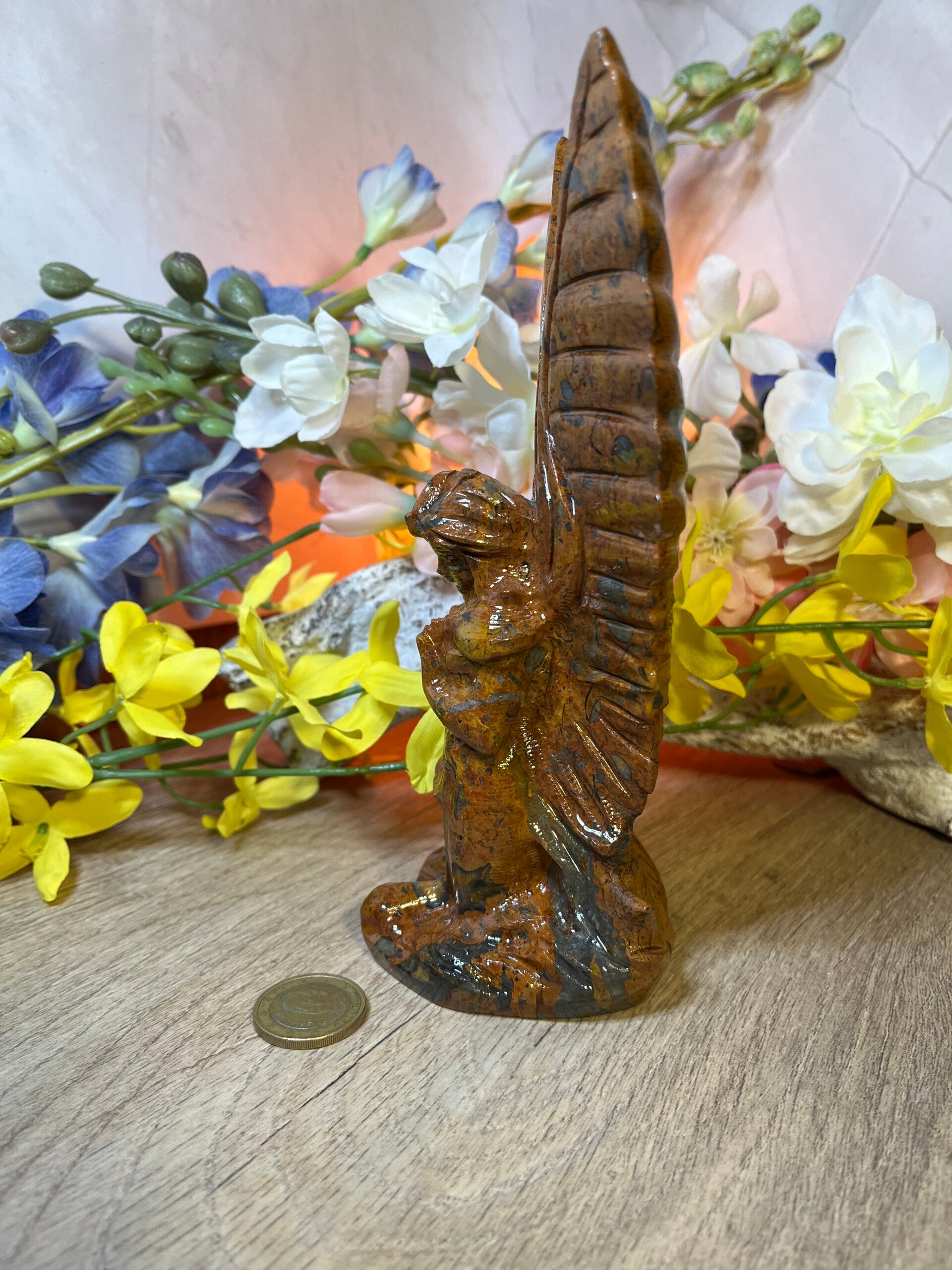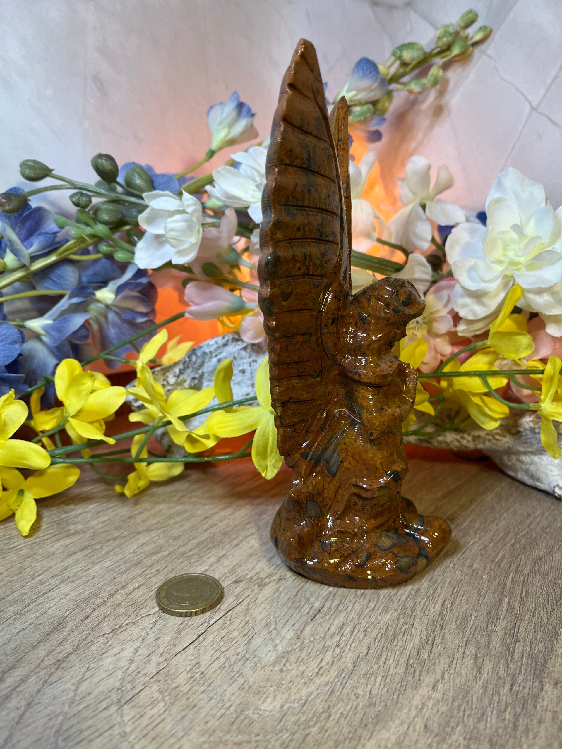 Een geknielde engel symboliseert diepe nederigheid, devotie en respect. Spiritueel staat dit beeld voor bescherming, steun en een verbinding tussen het aardse en het goddelijke. Het drukt troost, dankbaarheid en overgave aan een hogere macht uit.